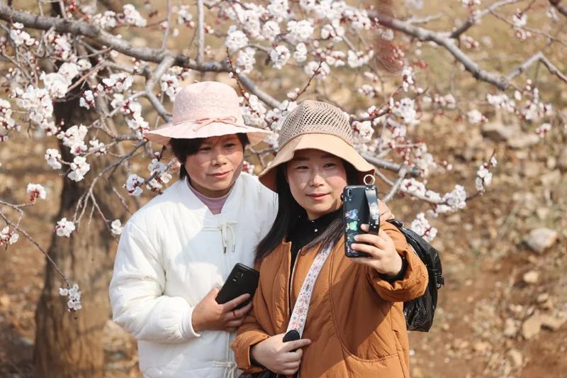 游客在杏樹旁邊拍照打卡。黃鶴鳴攝